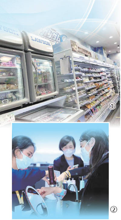 圖①:羅森便利店北京三元NEO新境大廈店一角。 圖②:消費(fèi)者在第四屆中國(guó)國(guó)際進(jìn)口博覽會(huì)松下展臺(tái)試用新產(chǎn)品。