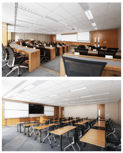 10層以下為教室和研討室,均采用頂級配置,包含數(shù)字教學設施、階梯教室、大小討論室教室、學生活動研討空間及儲物空間,共有75間教室、3450個座位,每層都有學生學習活動交流空間,方便同學們自習、休息、討論、交流,也在很大程度上滿足了多元化教學工作及學習的展開。
