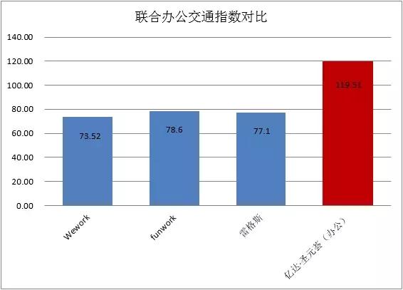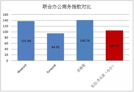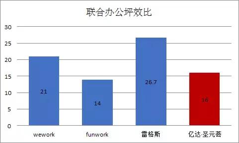 億達(dá)·圣元薈聯(lián)合辦公坪效比排第三位,這與所處地理位置有很大關(guān)系,所選取的對比項(xiàng)目wework和雷格斯均處于王府井商圈中心位置,且更靠近長安街,開放工位分別定價(jià)3000元/月和4000元/月,故單位面積租金明顯更高,坪效比也隨之有大幅提升。而與同處于商圈邊緣的funwork聯(lián)合辦公相比,則可以看出億達(dá)·圣元薈項(xiàng)目中聯(lián)合辦公的坪效比優(yōu)勢。